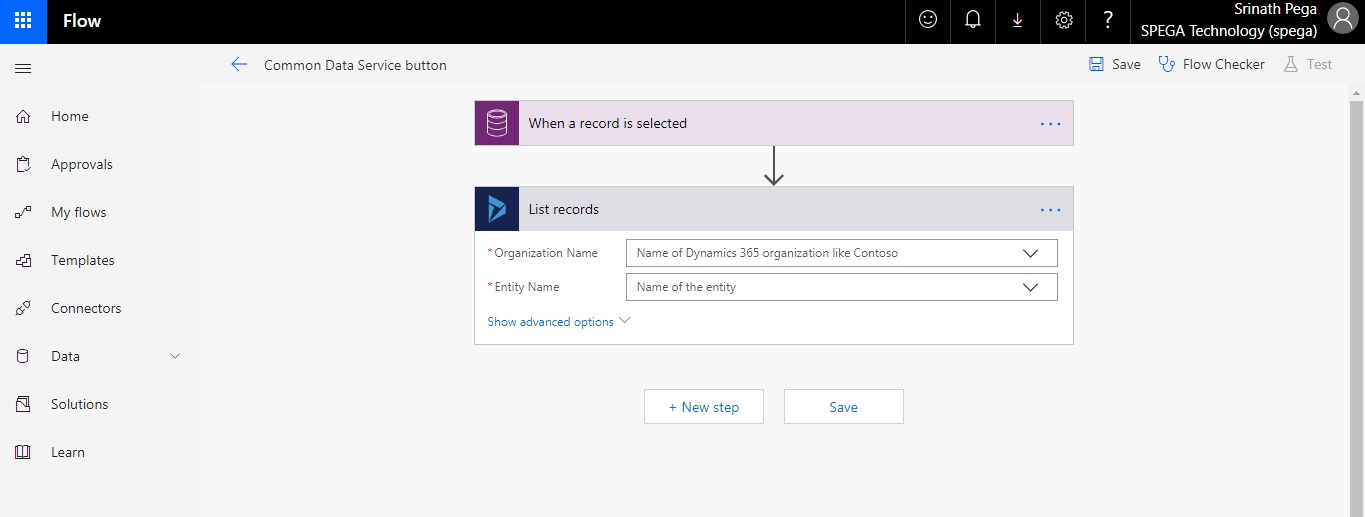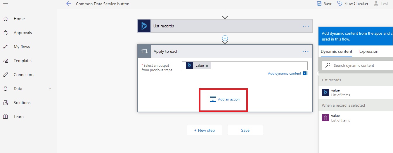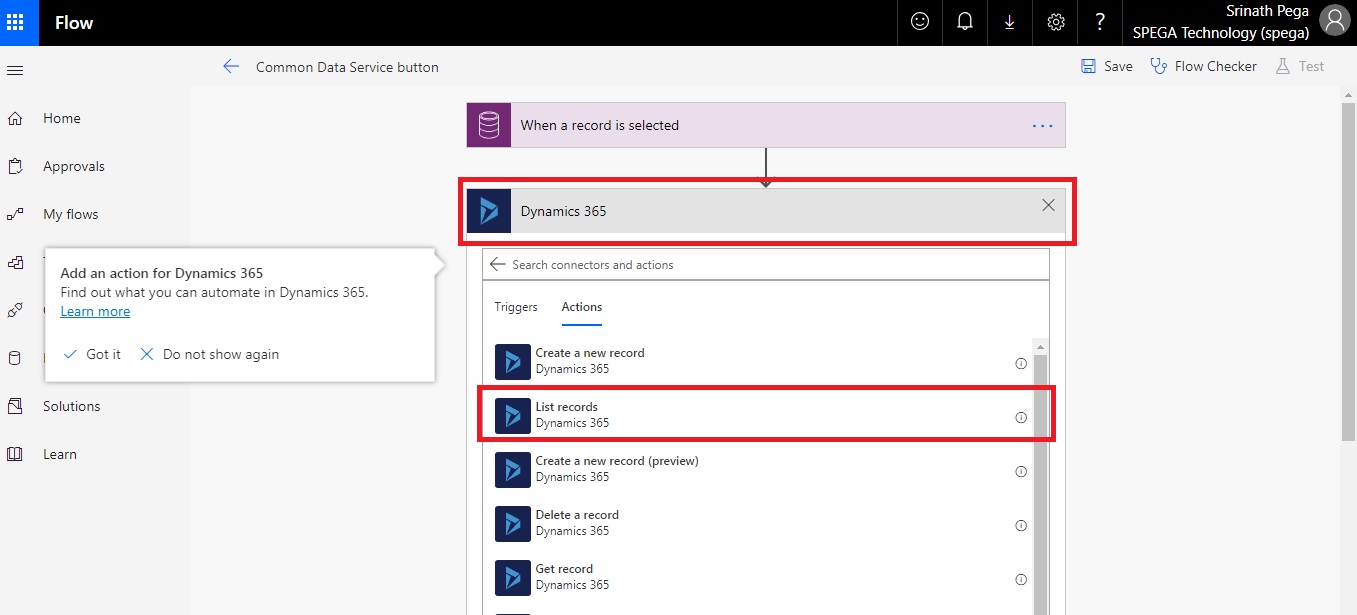 5. Next, we need to add our Actions. First, we will fetch all contacts related to selected Account. So select Dynamics 365 and then List records as below: