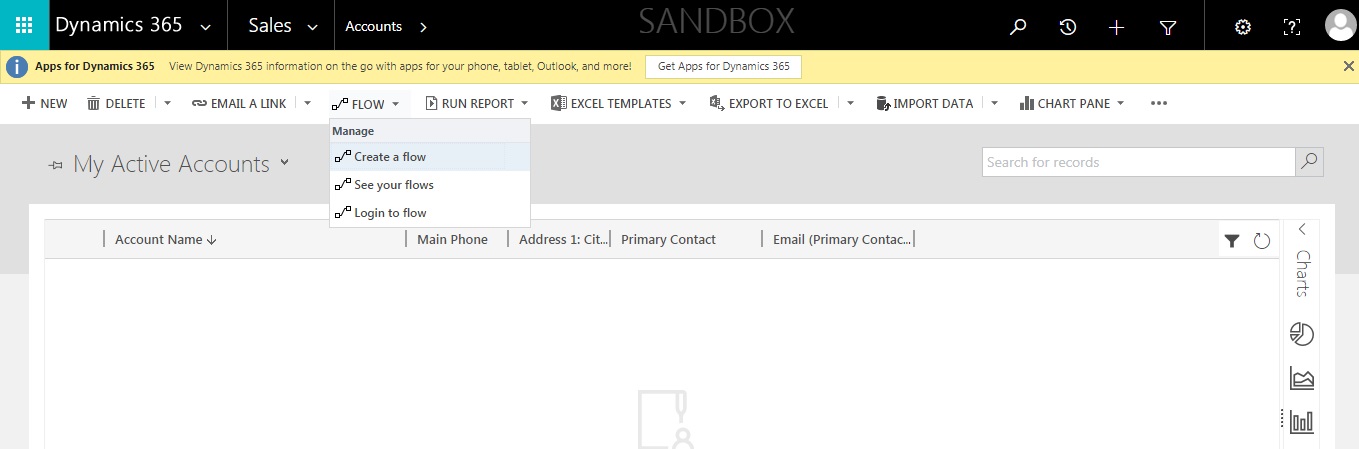 1. Navigate to Account entity in Sales Module and click on Flow flyout button.