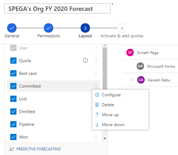 In the Layout step of the forecast configuration, you can configure columns to define the forecast grid that appears for users. You can configure roll-up columns from option sets that are defined for opportunities in your organization.