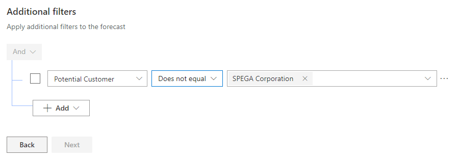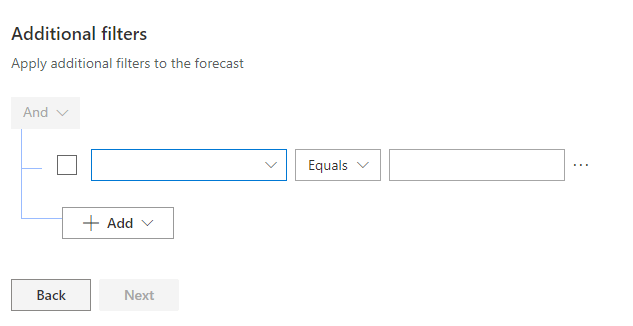 Using additional filters, you can filter the opportunities that participate in calculating the forecast values. To filter the opportunities, you create filters based on conditions by using the attributes that belong to the Opportunity entity, including related entity attributes.