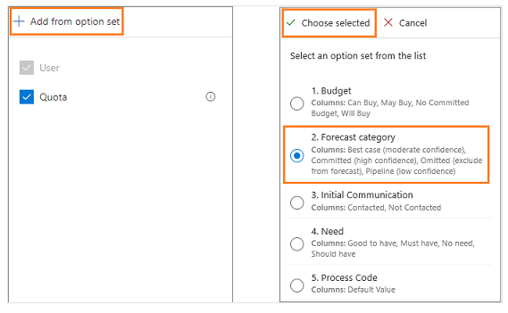 - Choose an option set, and then select Choose selected. The list shows only the option sets defined on the opportunity entity. Each option set value you select is added as a column for you to configure.