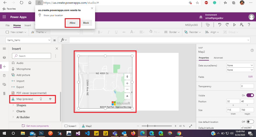 - Select the component Map to place it in the center of the app screen, or drag it to position it anywhere on the screen.