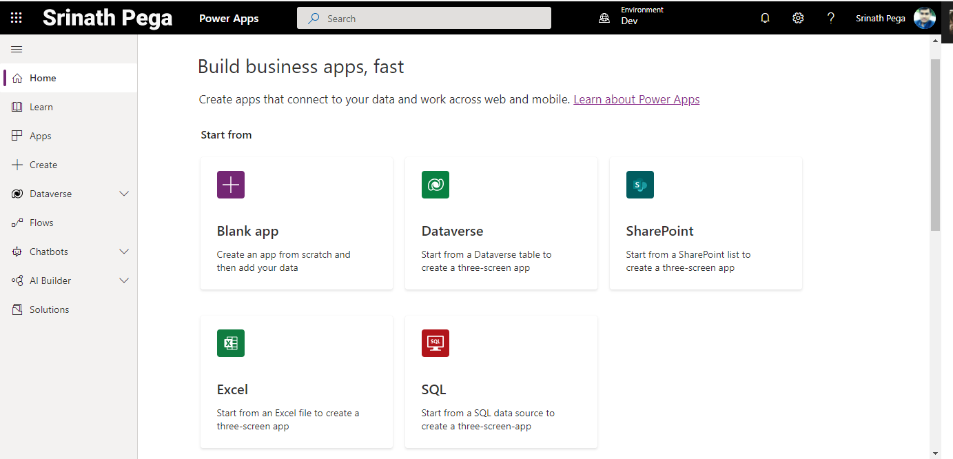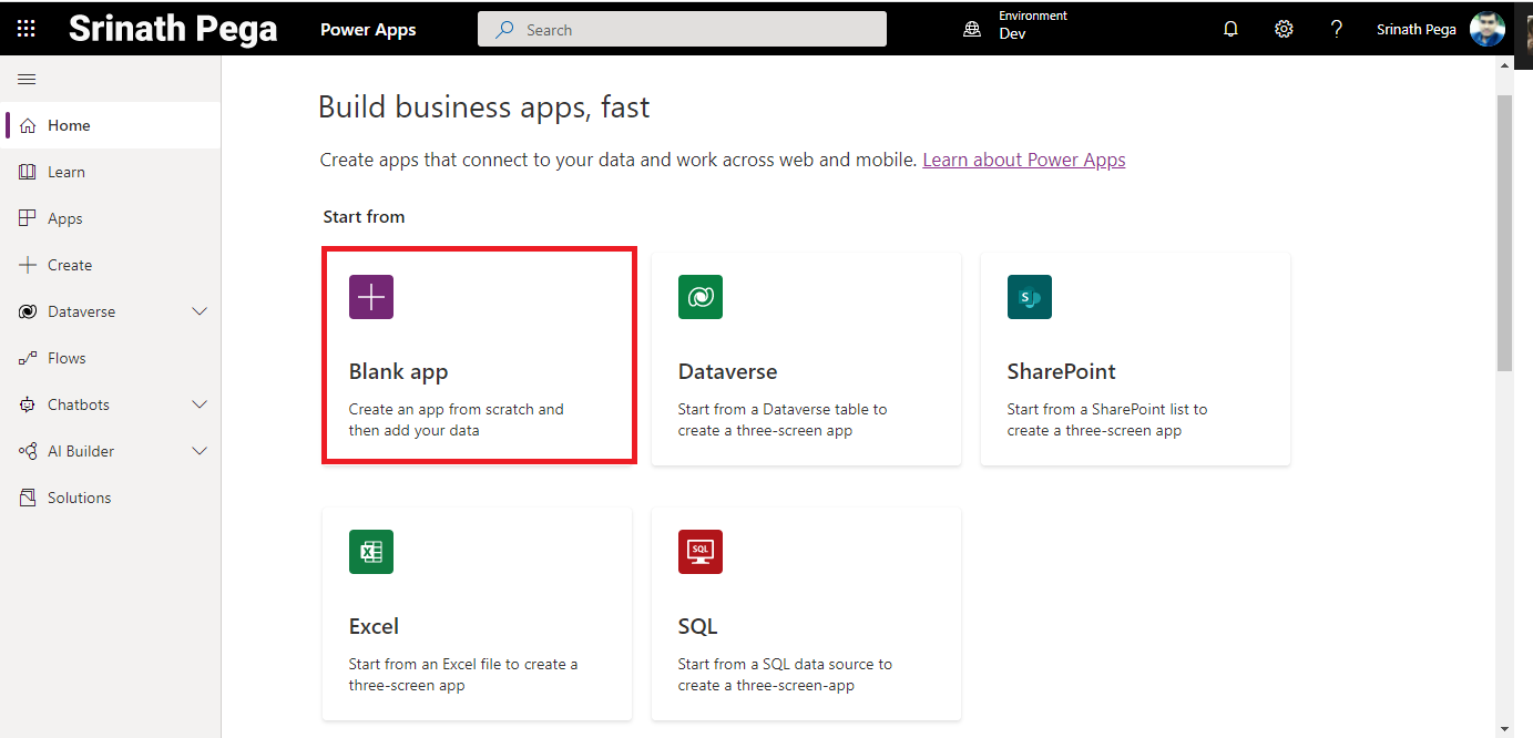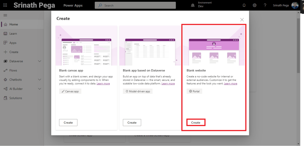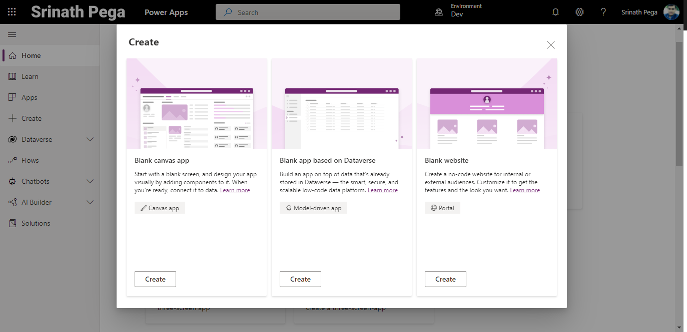 3. Opens the popup to create an App from Blank for Canvas App, Model-Driven App and Power Portals.