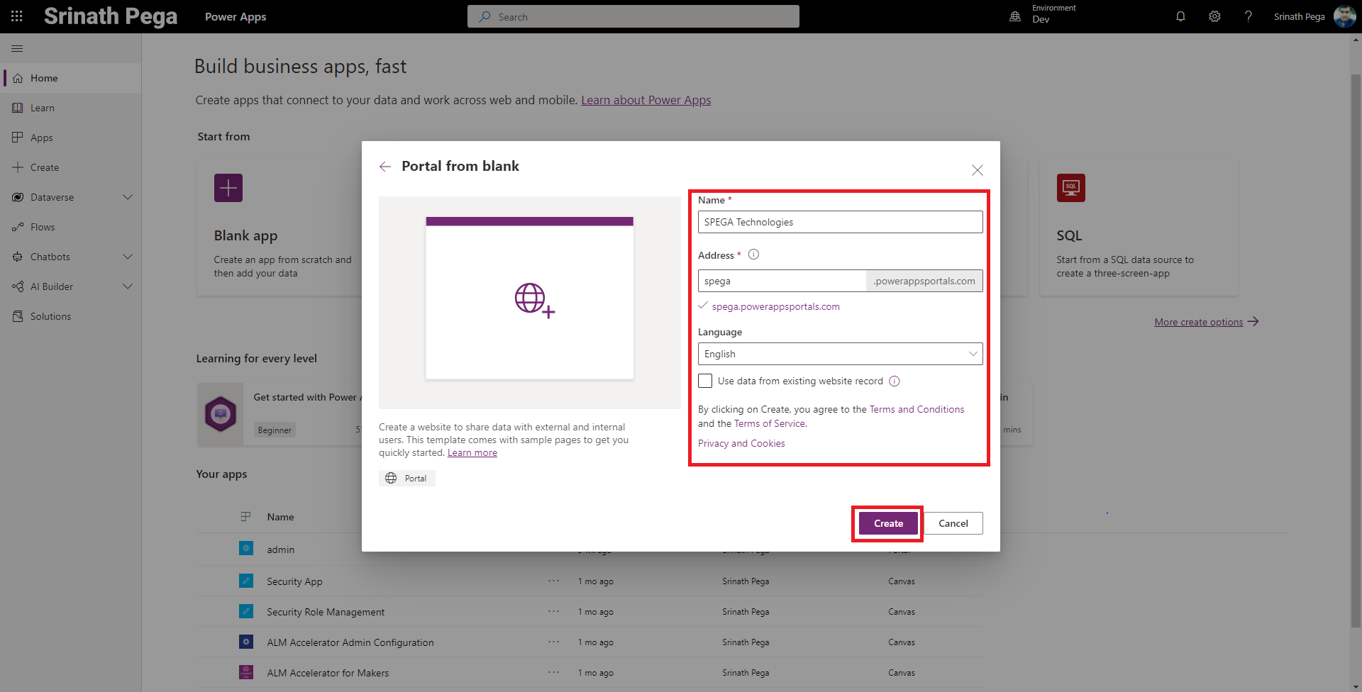4. Portal is asking Name of the Portal (SPEGA Technologies), Protal Site Address (SPEGA), website URL looks like “addresss.powerpassportals.com” in my case “spega.powerappspowerportals.com” and Language is same as the Environment language.