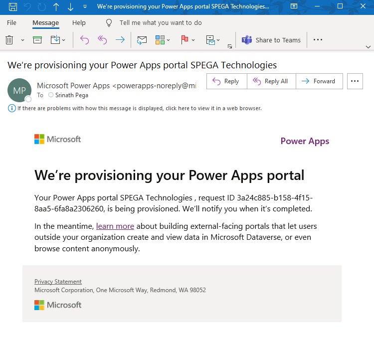 6. Power Apps will send an e-mail the status of Power Apps Provisioning.