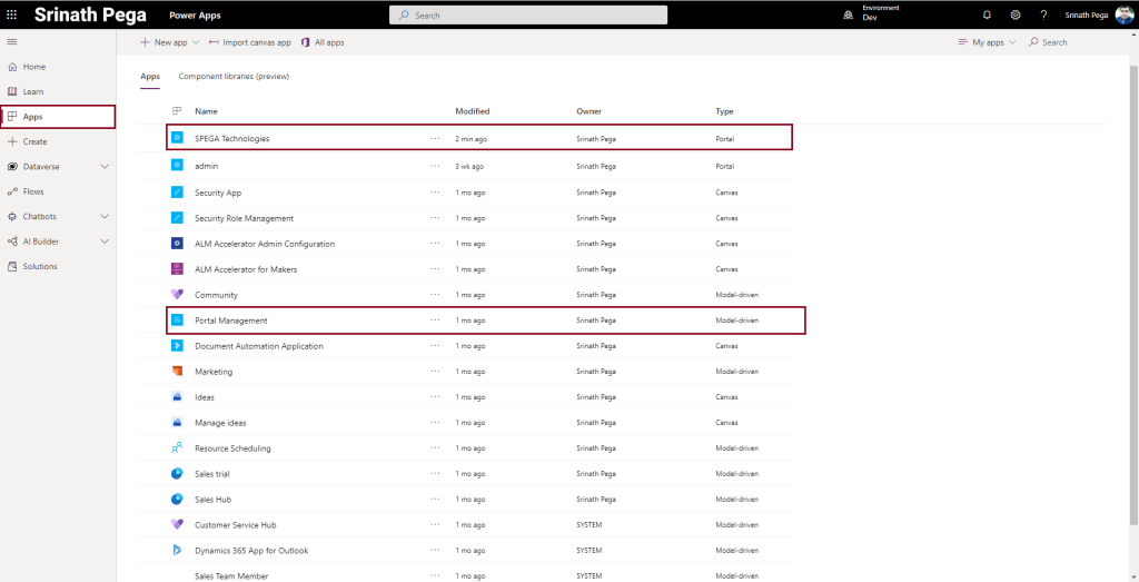 8. Now go to Power Apps Make Portal and Click on App in left pane. We can see the Power Apps Portal (SPEGA Technologies) and Portal Management Model Driven Apps will be created.