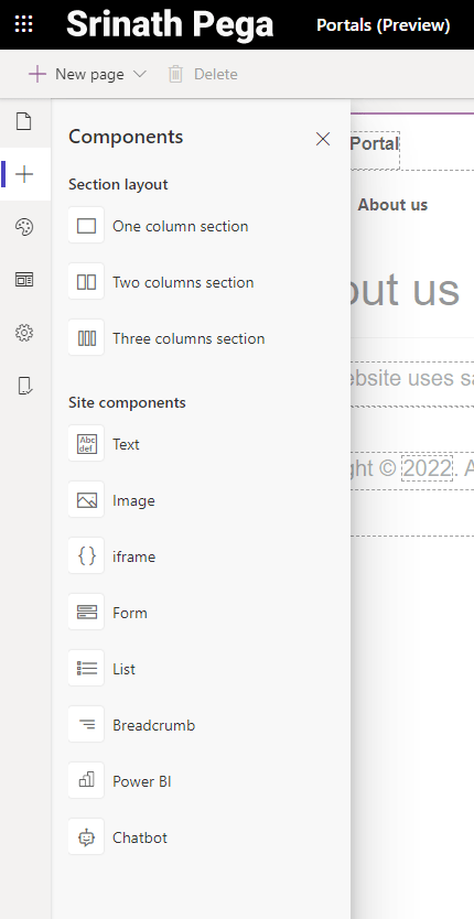 Power Apps Portal maker can add a set of predefined components on the page to format the layout and add static and dynamic content.