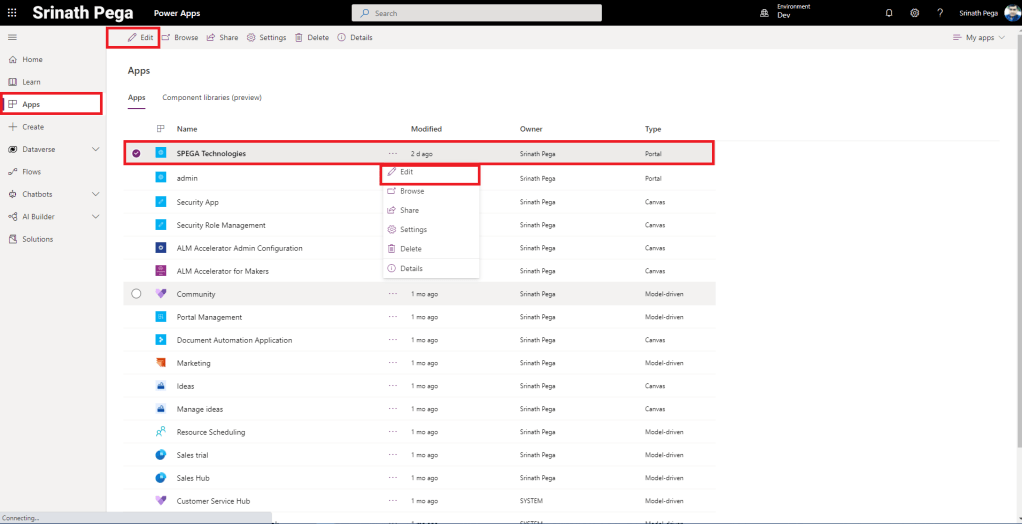 - Clink on Apps on the left Pane, and select the Power Apps Portal and Click on edit.