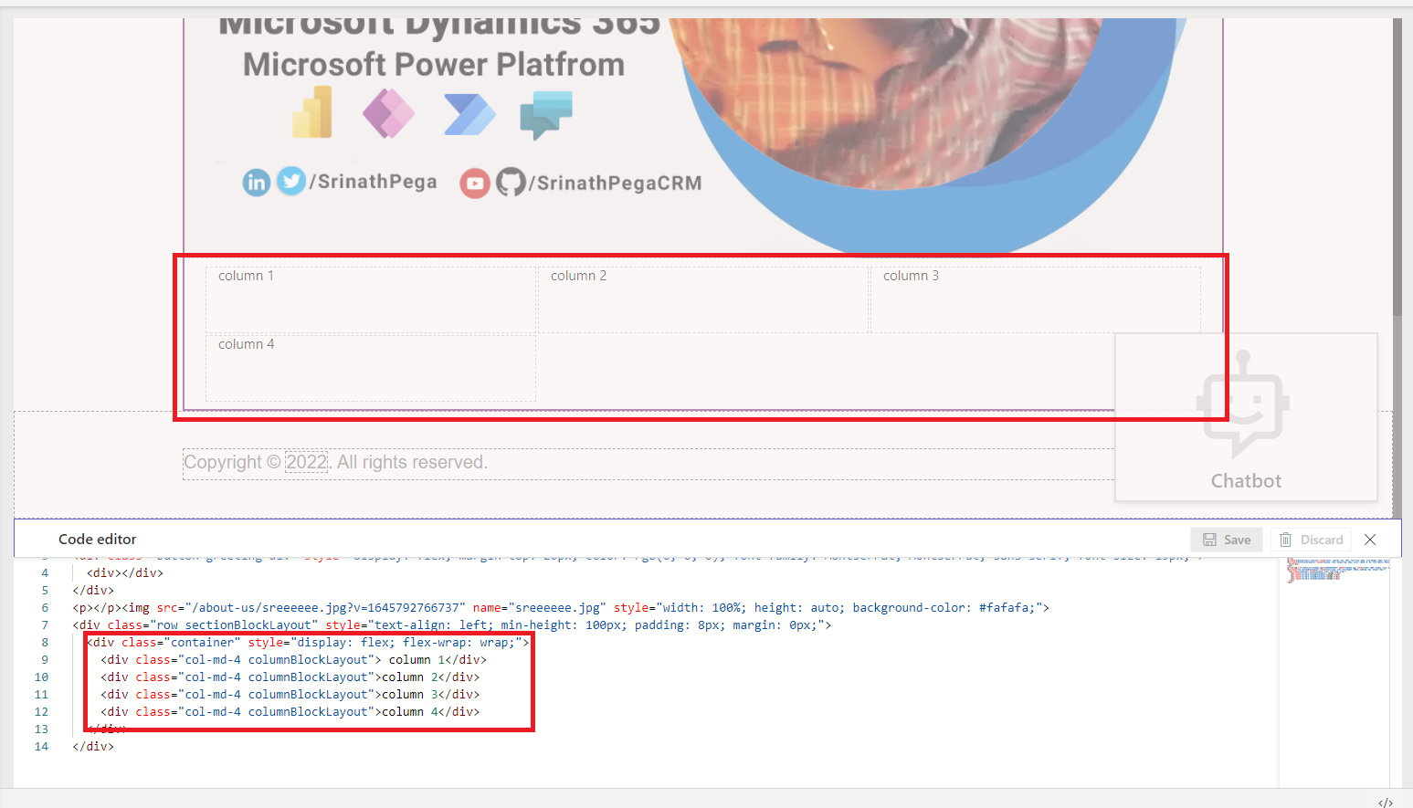 9 . To make the section as 4 colunm, add the code <div class=”col-md-4 columnBlockLayout”>column 4</div> to the surce code.