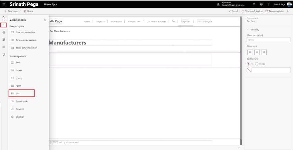 8. Now we need to add the Entity List component to the one-column section layout from the left pane.