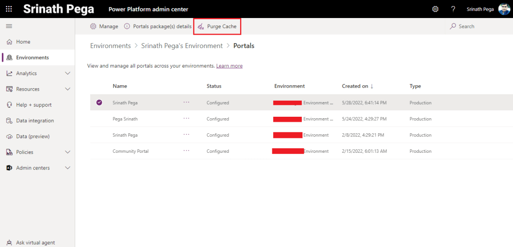 Static website contents are in CDN servers across geographical locations. You can clear the cached content using the Purge cache button. This action will clear the cache from the CDN server and portal website.