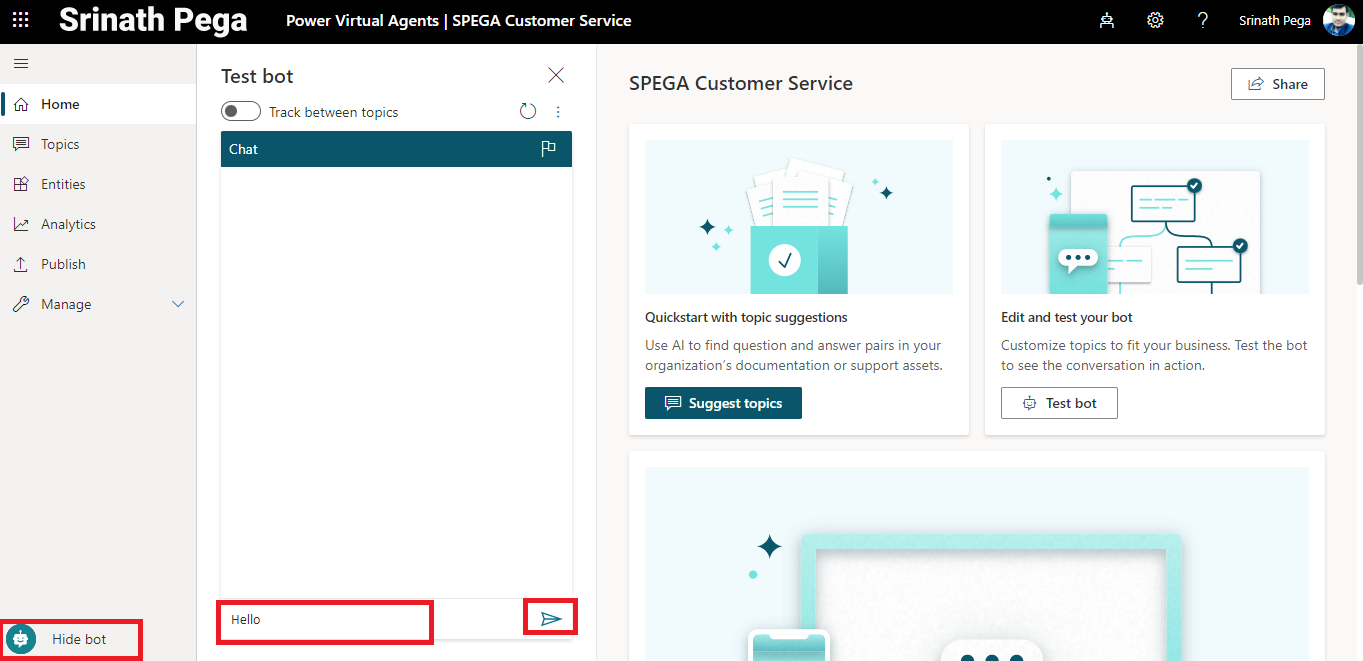 To show the Test bot, in the bottom left corner of the screen, click Test your bot. (If the button says “Hide bot”, then your Test bot is already showing.) At the top of the Test bot, turn on the Track between topics toggle.