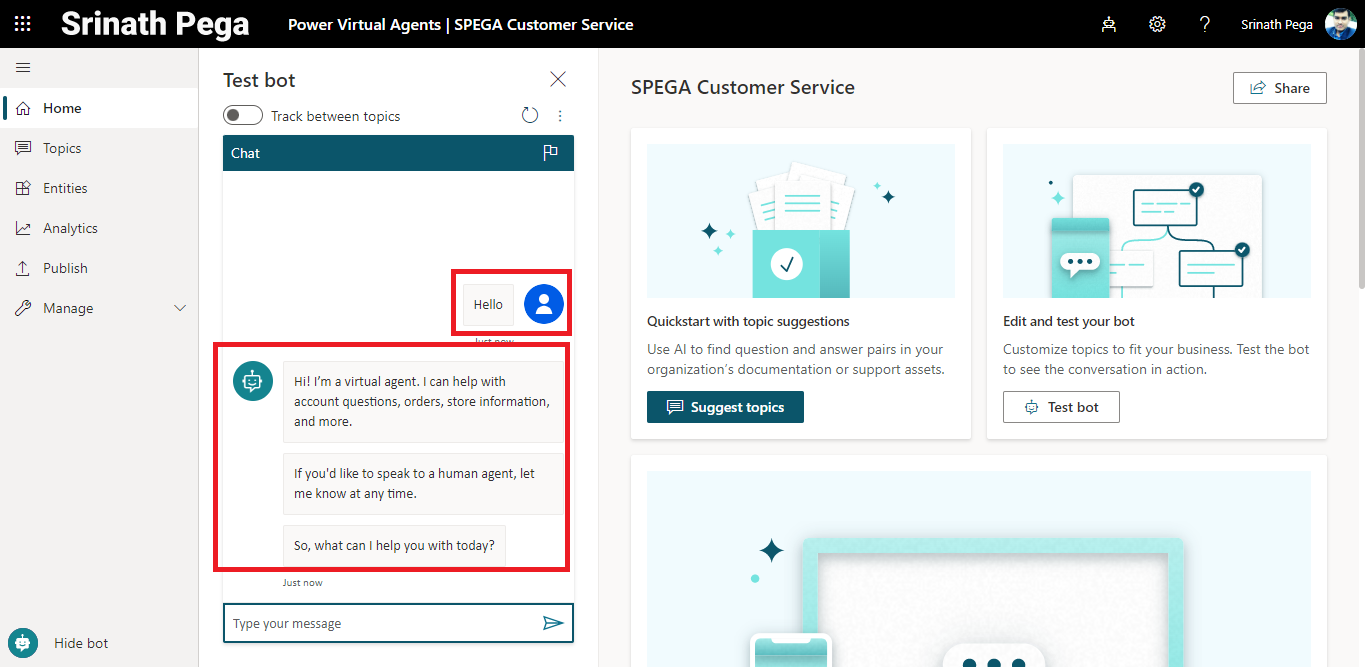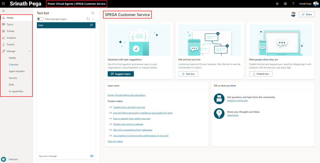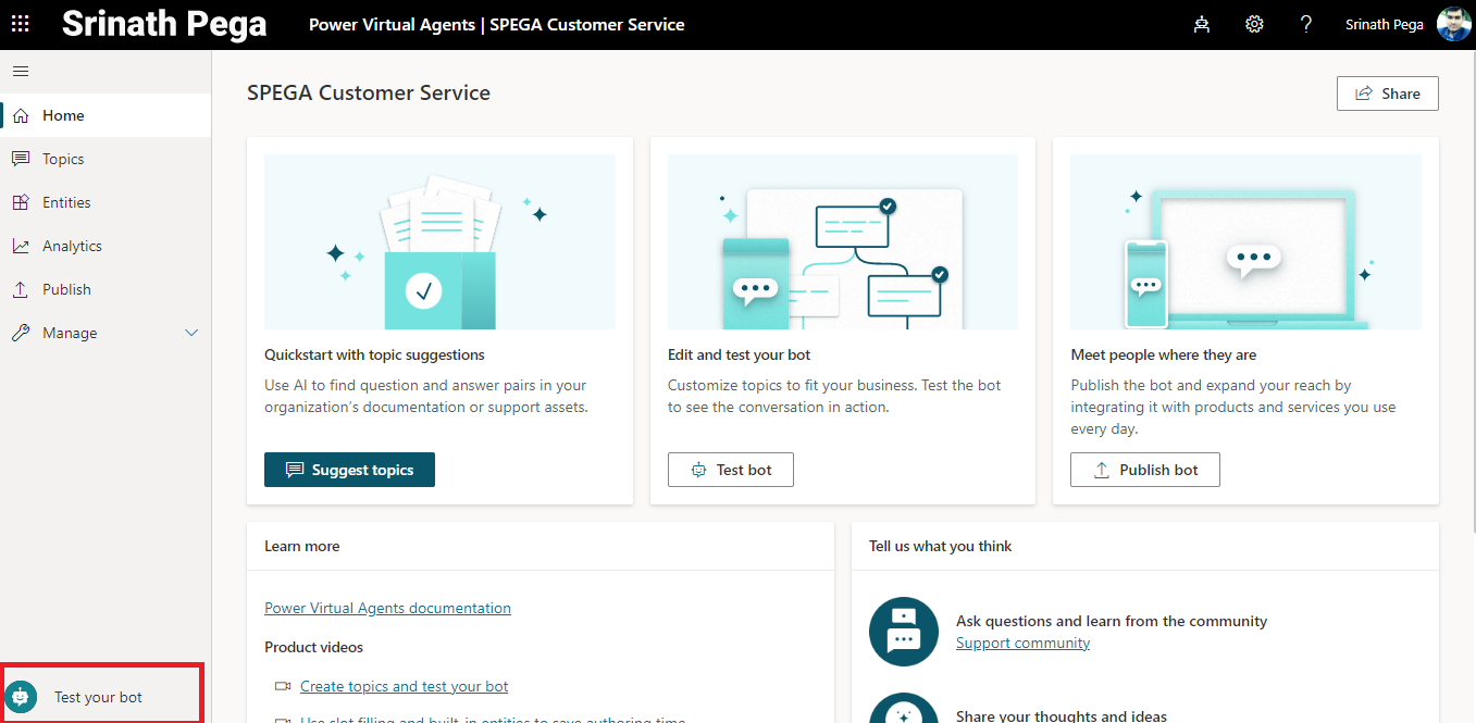 - Home: Includes shortcuts to Customize your greeting and to the Topics, Publishes, and Analytics pages, as well as links to Power Virtual Agents documentation, a Support community where you can ask questions, and an Idea forum for sharing ideas and leaving product feedback.