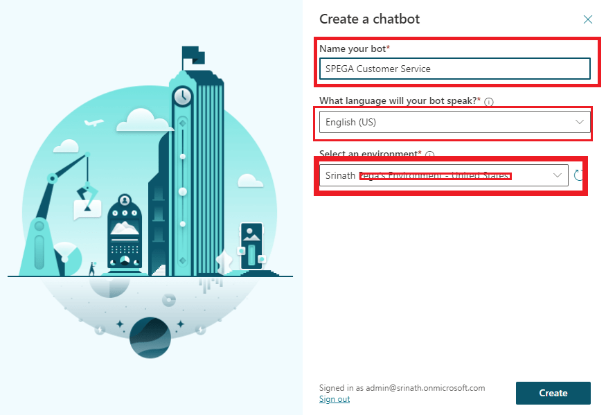 3. Name your bot SPEGA Customer Service, Select English as the Language then selects the Environment for the PVA chatbot.