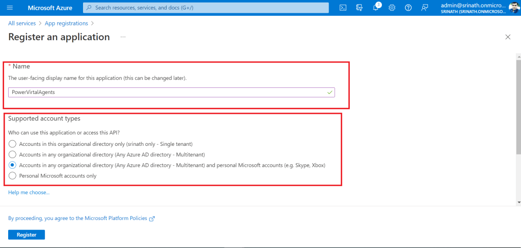 4. Give the Name for the App Registration and select on Accounts in any organizational directory (Any Azure AD directory – Multitenant) and personal Microsoft accounts (e.g. Skype, Xbox).