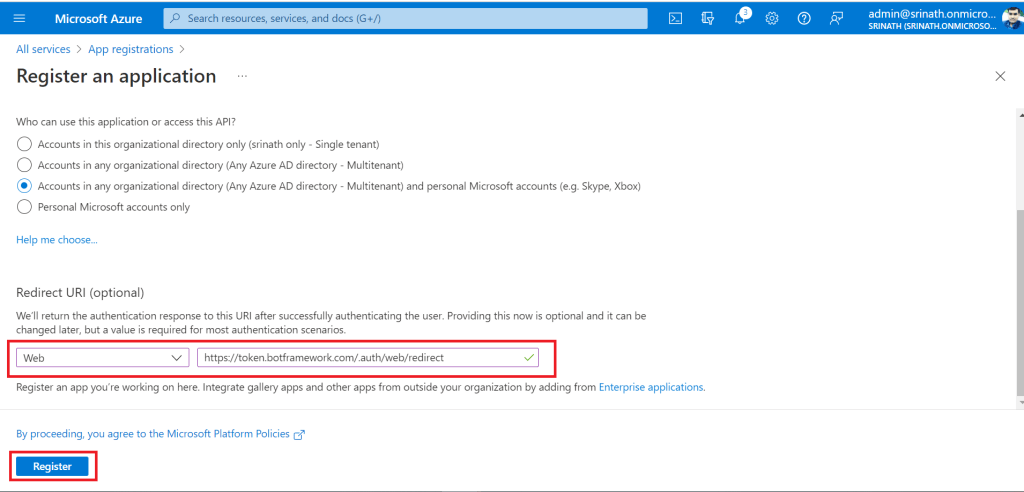 5. Give the Redirect URI. (https://token.botframework.com/.auth/web/redirect) and Click on Register.