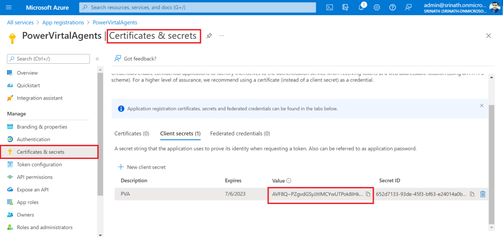 6. Click on Certificates & secrets in the left navigation panel and click New client secret.