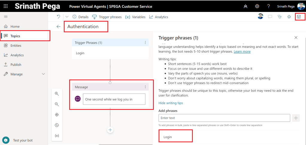 5. Give the Name to topic and Give the Trigger phrases and Click on Save.