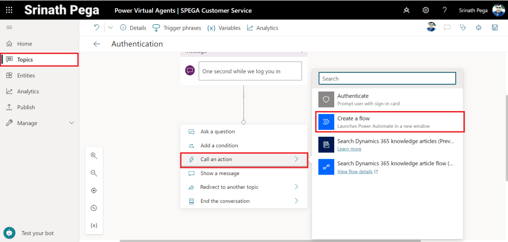 6. Click on add New Node to the Massage Node and select the option Call an action and select Create a flow.