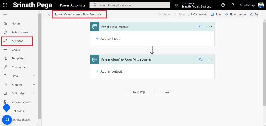 - Go To My Flows and Open Power Virtual Agents Flow Template