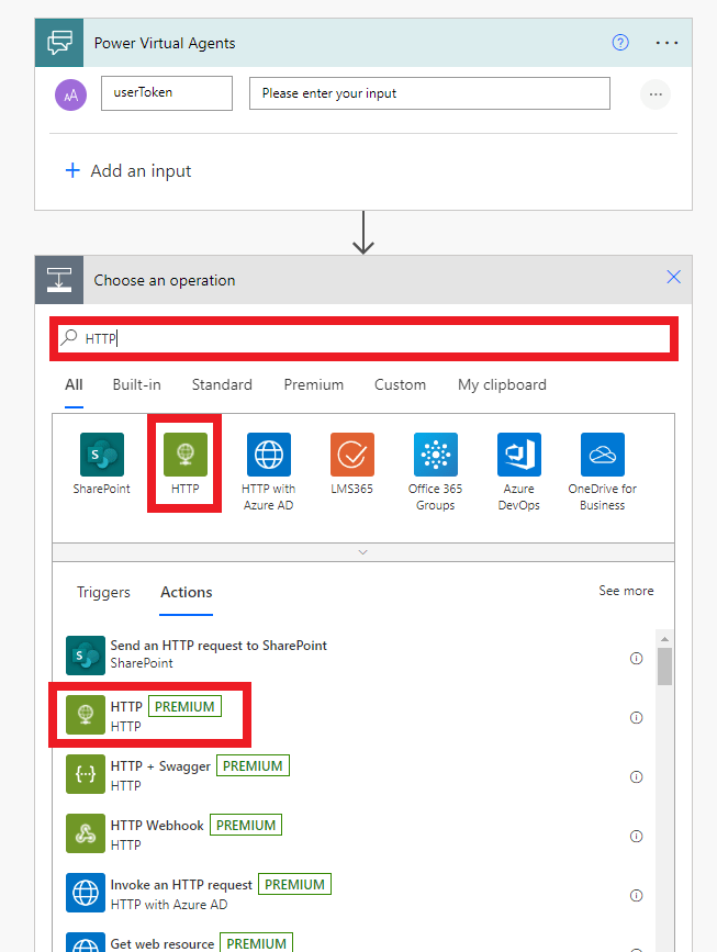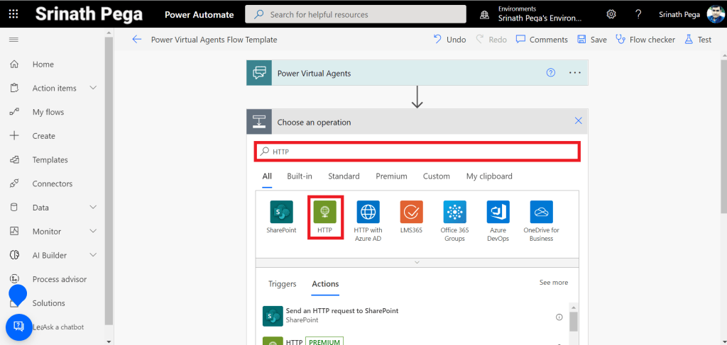 7. Select the Add an action and Search for HTTP and Select the HTTP connector.