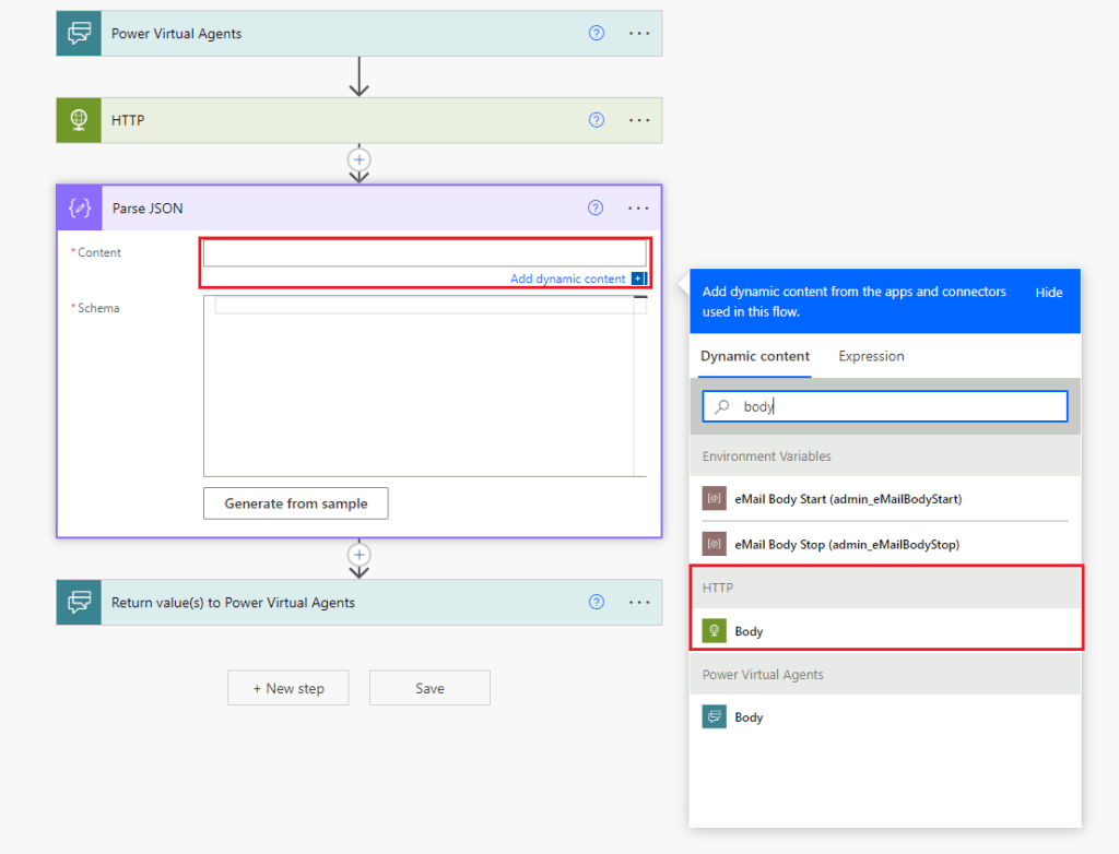 9. Now we need to take the data that comes back from the Microsoft Graph API and turn it into a format that can be returned to the chatbot and displayed to the user. For this we will use the parse JSON action.