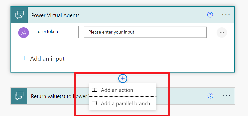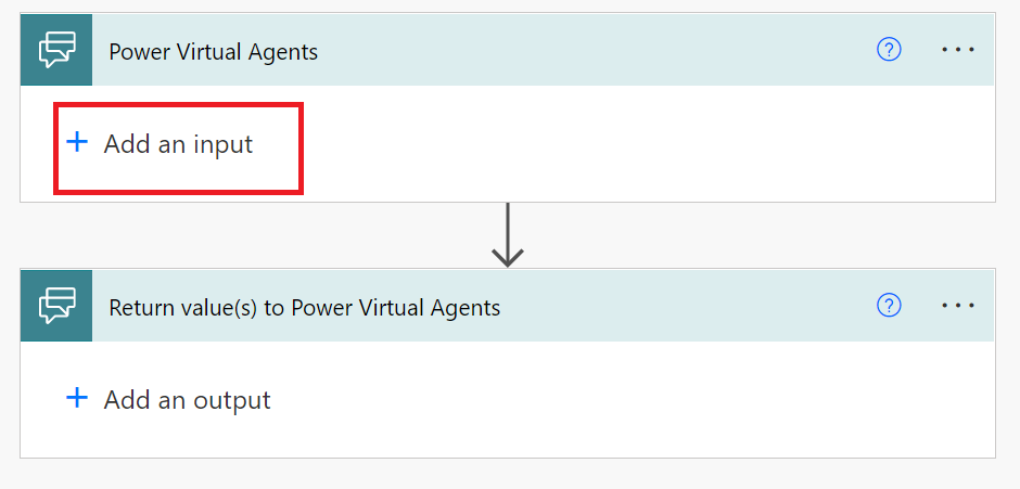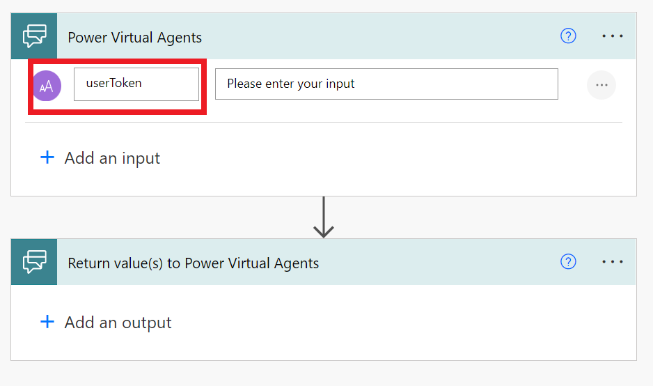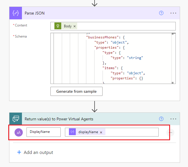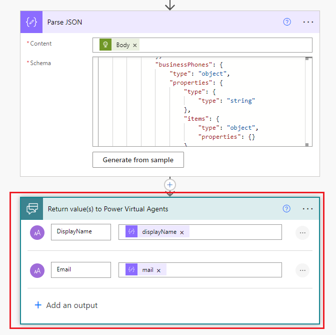 14. Click on the Return value(s) to Power Virtual Agents action to open it up, and click on Add an output.