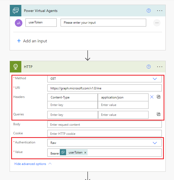 To enter the Value field, type Bearer then leave a space, then select userToken from the Dynamic content. (This is the authentication token that has been passed through from your chatbot when the user logged in)