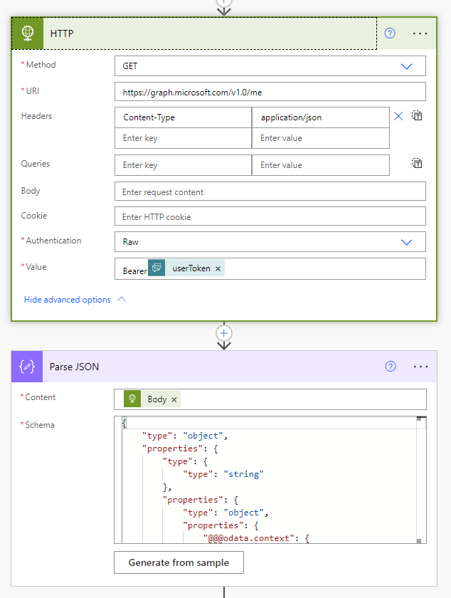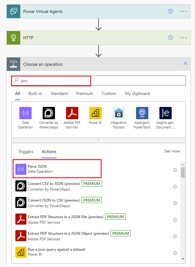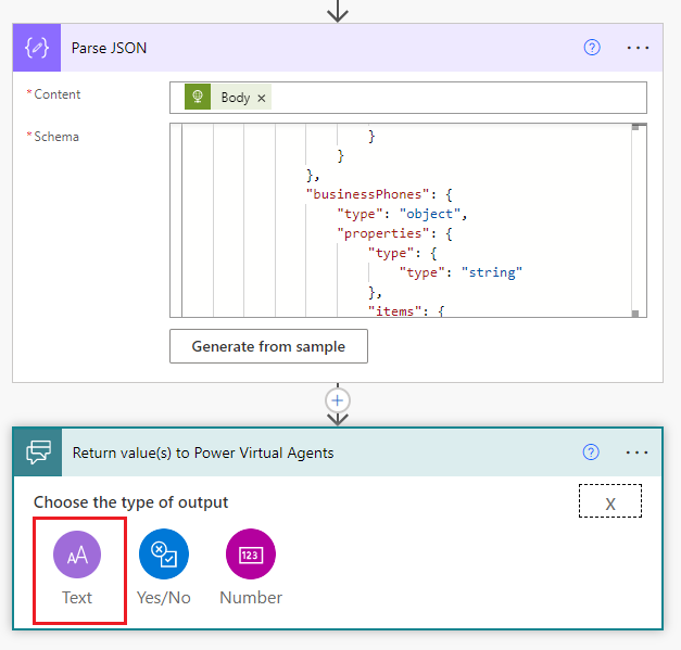9. Now we need to take the data that comes back from the Microsoft Graph API and turn it into a format that can be returned to the chatbot and displayed to the user. For this we will use the parse JSON action.