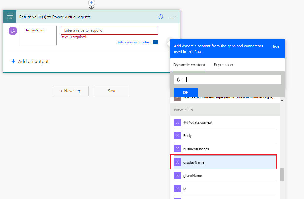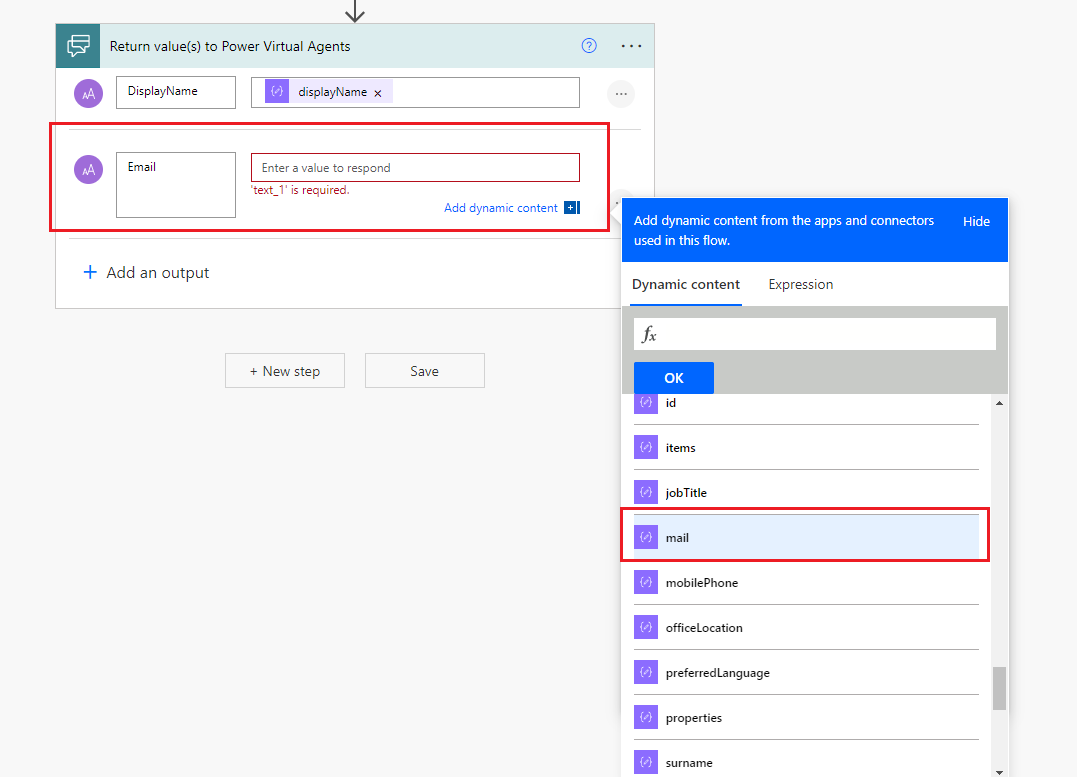 18. Add another Text input and repeat these steps, creating the display name Email and choose mail from the Dynamic content.
