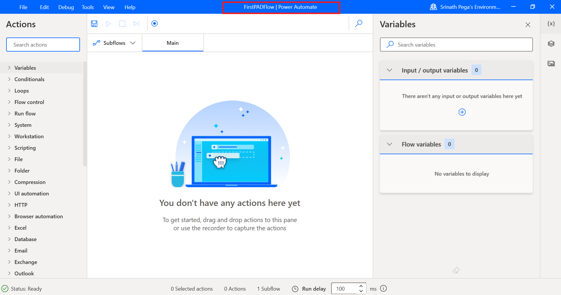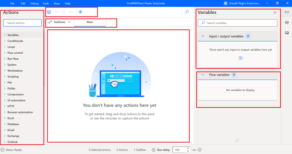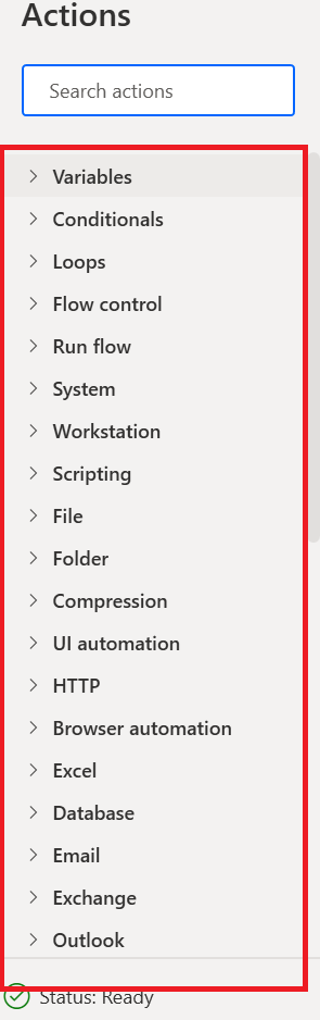 7. Actions pane – Contains all Power Automate for desktop Actions and includes