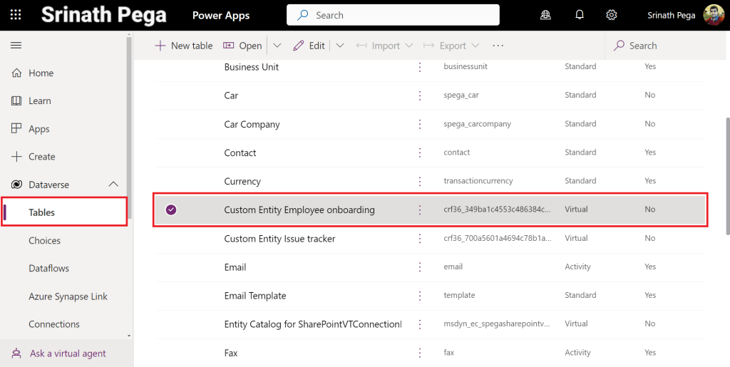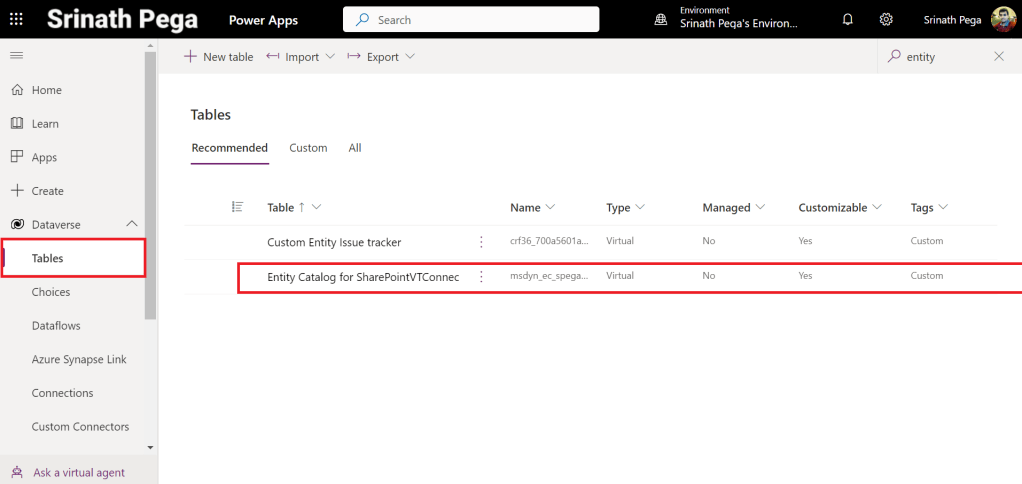 - The tables displayed in the entity catalog are not virtual tables in themselves. You need to select from this list of tables representing the external data to create the virtual table in Dataverse.