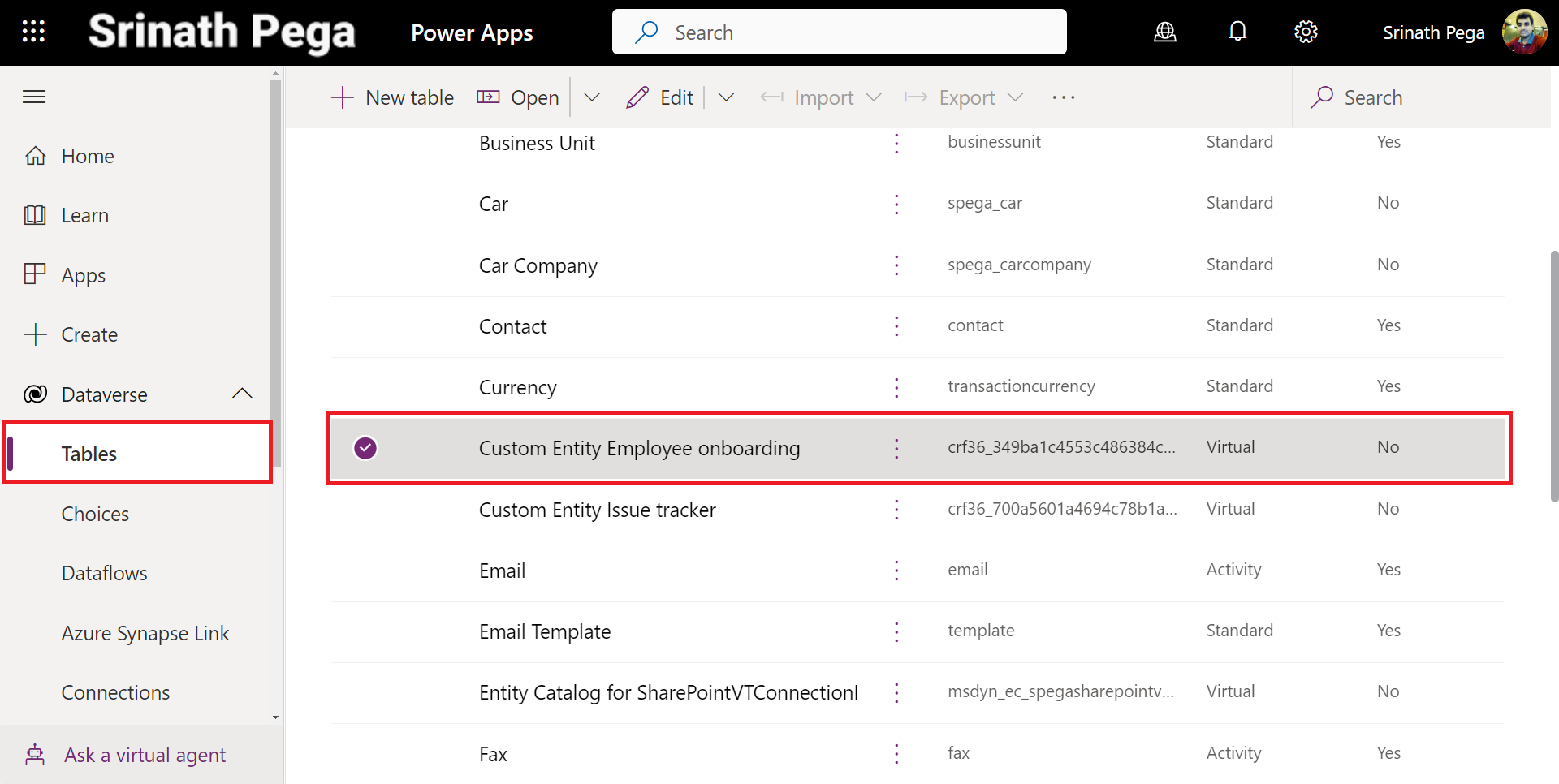 - Select Dataverse and Click on Tables.