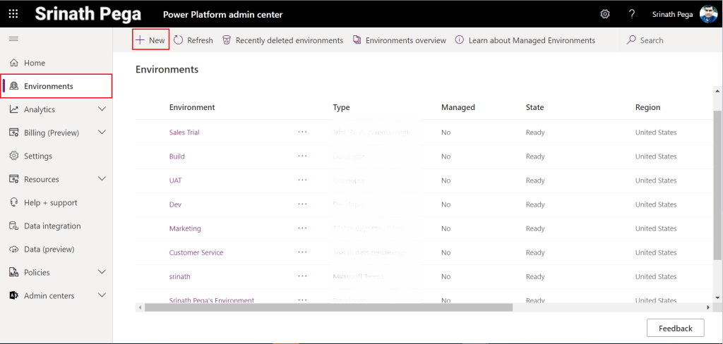 10. Click on the Environment left pane and click on New to Create Dataverse Environment.
