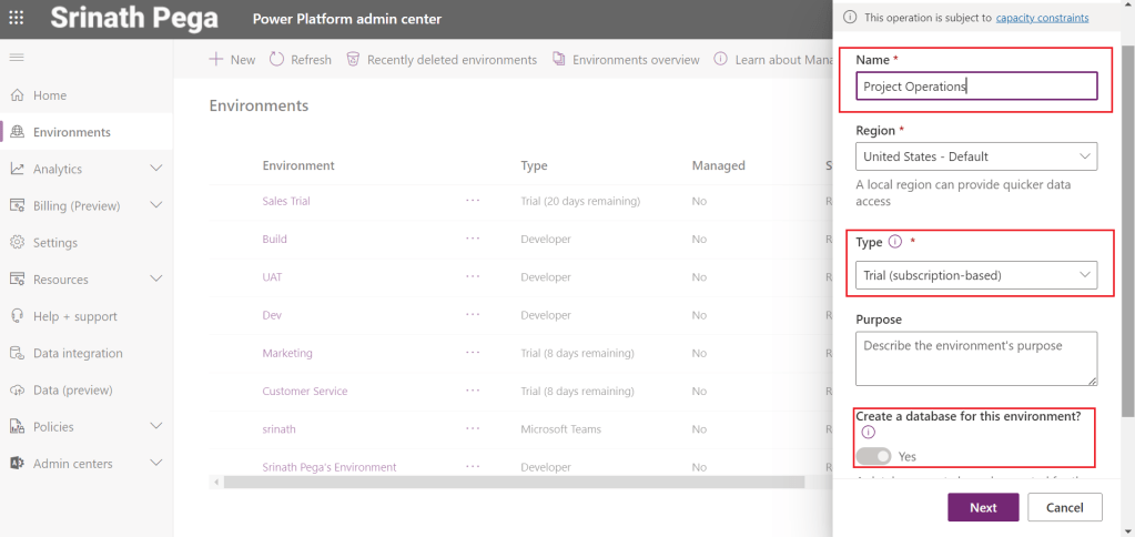 11. Give the Name of the Environment and type make sure to use Trial (Subscription based). Click Next.