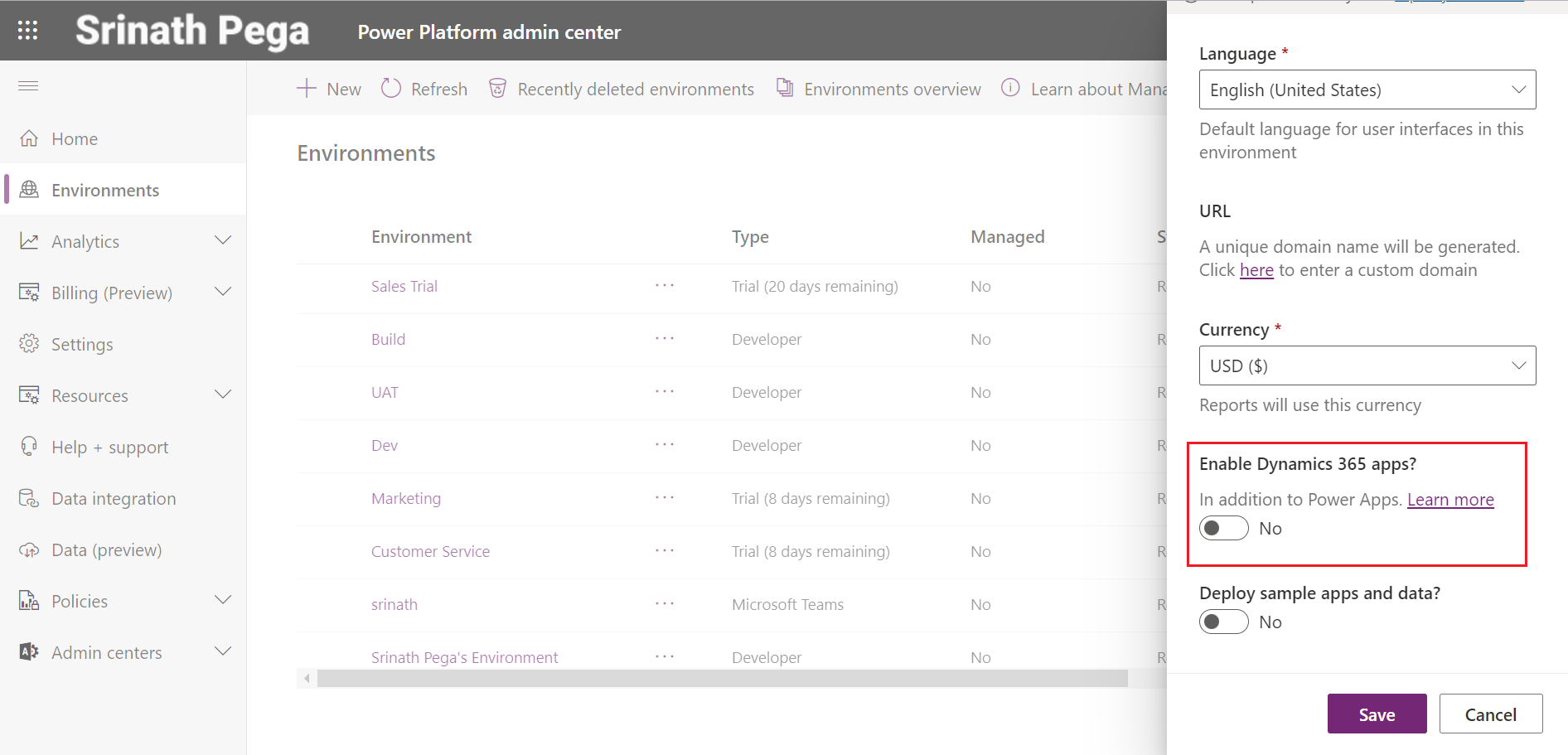 12. Enable the Dynamics 365 apps field is set to No and Click Save.