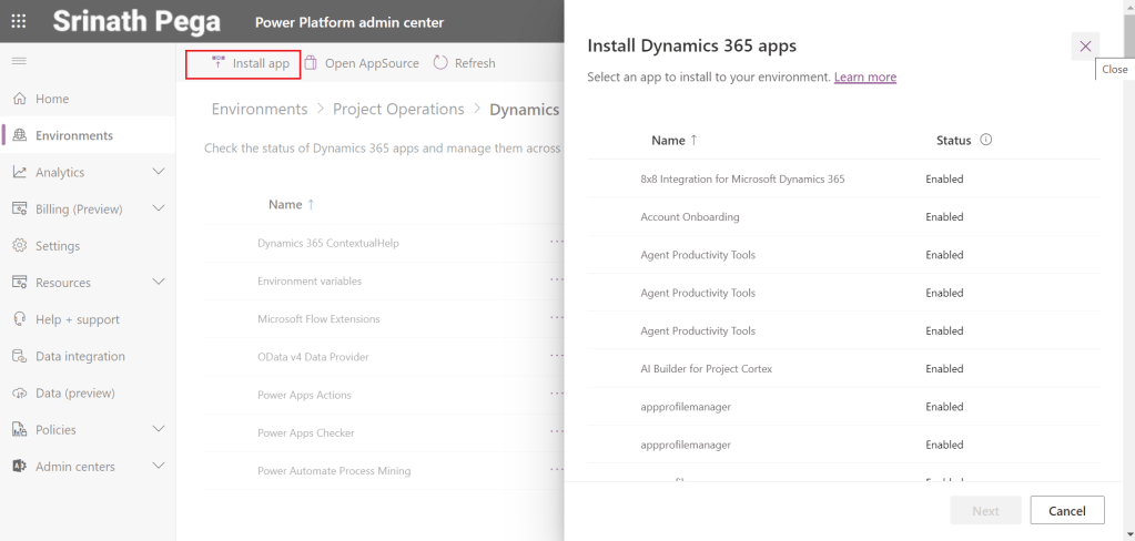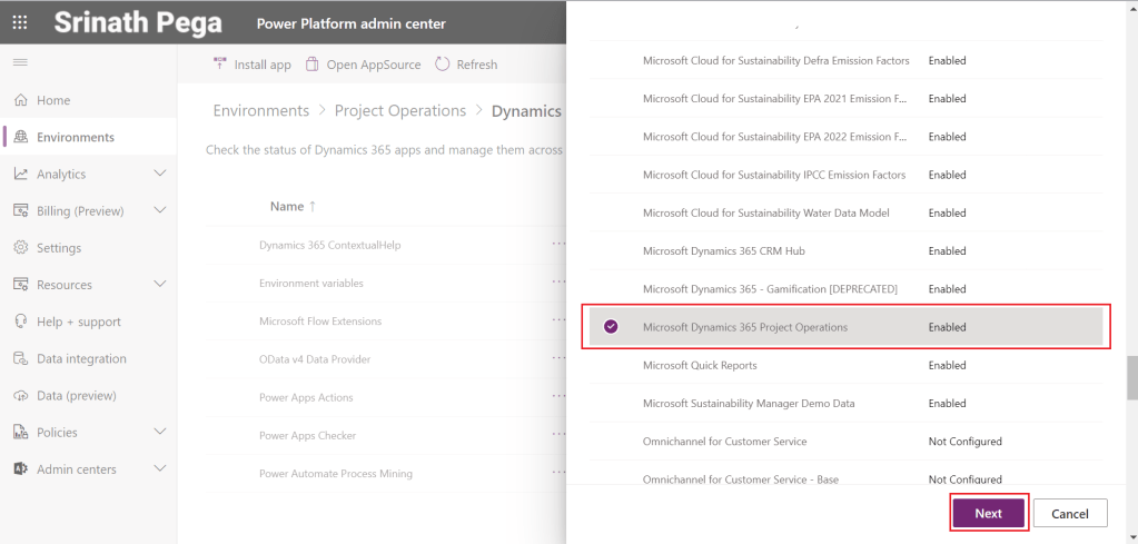 16. Select Microsoft Dynamics 365 Project Operations to Enable in Dataverse Environment click next.
