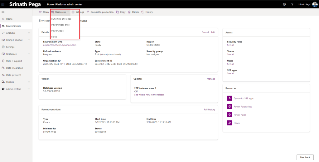 14. Open the environment, Click on the Resources, and select the Dynamics 365 apps.