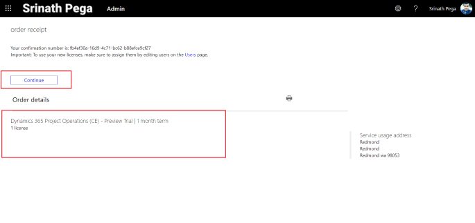 4. Click on Continue to finish the Project Operations (CE) – preview Trial.