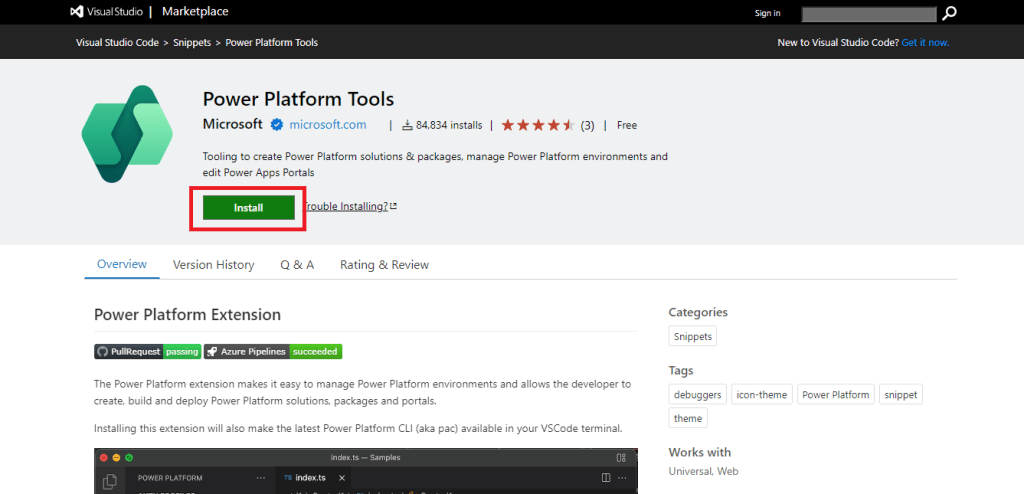 5. Optionally, you can initiate the install into Visual Studio Code directly from Marketplace and it will launch Visual Studio Code and commence the extension installation.
