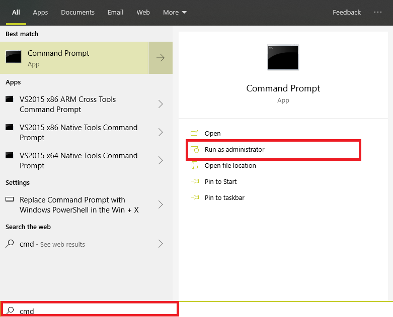 7. Search for cmd in the Windows start menu and Click on Run as administrator of the Command Prompt.