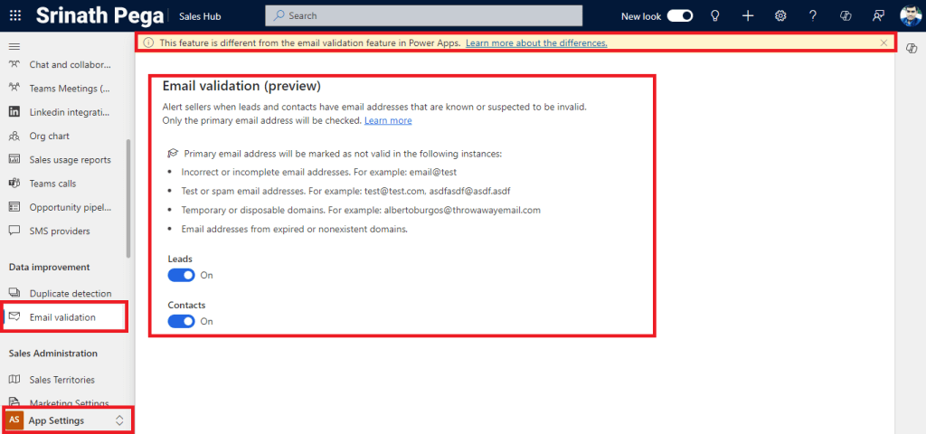 - In the Sales Hub site map, select Change area > App settings > Data improvement > Email validation.